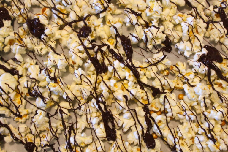 - Melt down the chocolate in 30 second intervals then drizzle all over the top of the popcorn.
