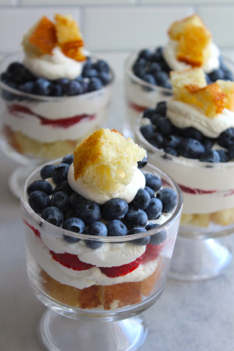 6. You can either assemble one large trifle or several mini ones. Begin by placing a few pieces of vanilla cake to cover the bottom of the trifle dish. Next, top with a layer of whipped cream, then sliced strawberries, more whipped cream, blueberries then top with a dollop of whipped cream and cake on top!