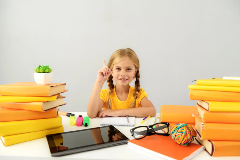 Intelligent child sitting at the desk with books