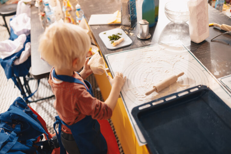 Cooking baking workshop class for school kids. Cute little boy in kitchen apron playful learning to bake cakes having fun. Kids playing with wheat flour and rolling pin