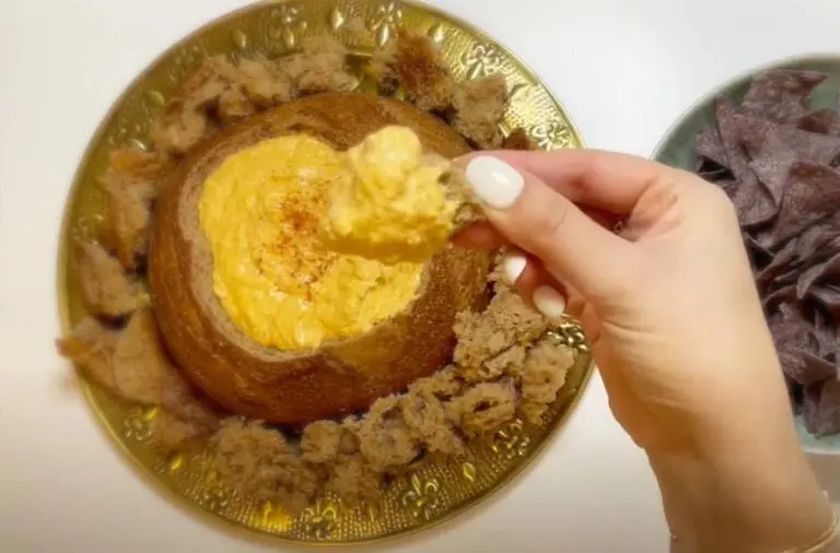 5. Pour the dip into a bread roll. Add a pinch of cayenne pepper on top. Enjoy!