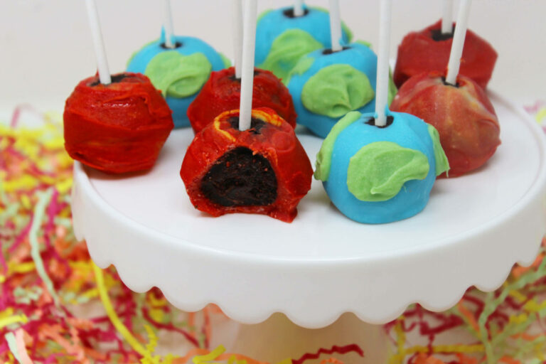 This recipe is a chocolate cake pop coated in colored candy melts. My favorite part about this recipe is that they are meant to be different from the traditional smoothly dipped cake pops you see everywhere. At Baketivity we are always encouraging kids to explore their creativity and imagination in the kitchen. These cake pops are a perfect example of how to make them your own and have fun with it. I purposely added texture to the Mars cake pops and a 3-D effect on the land sections of my planet Earth cake pops to add extra special detail.