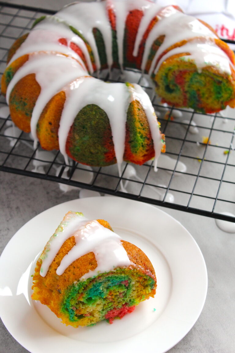 - Layer the colors of batter throughout the bundt pan then use a toothpick or skewer to swirl the colors throughout the pan.