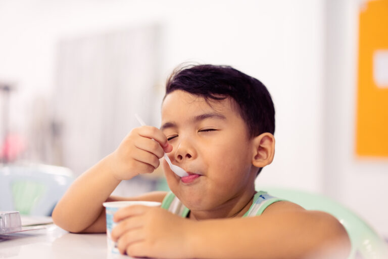 Ask your child to find a specific fruit, such as “find the cup with apple” by taste this time. They can now use the fork to pick out the piece of fruit from each cup and lick it to determine which cup has that fruit. Repeat with the other fruit options.