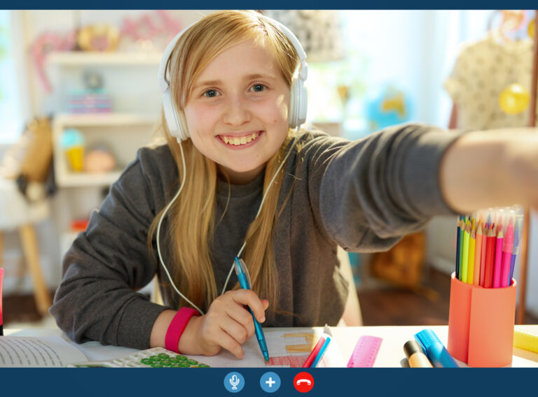 Portrait of smiling modern child with headphones homeschooling, having video conference at home in sunny day.
